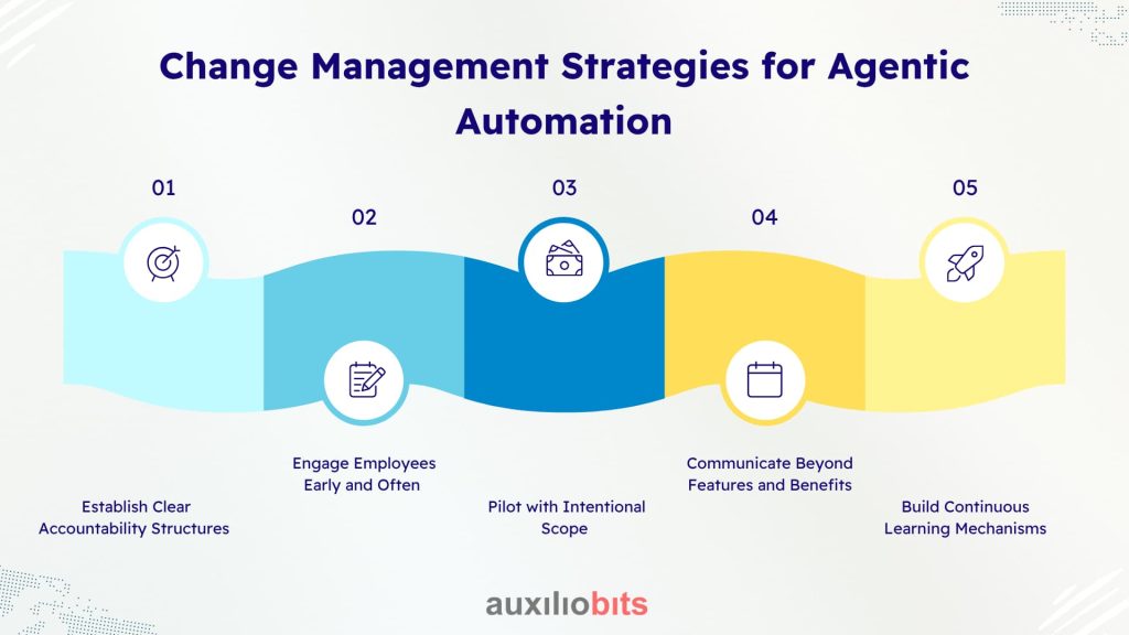 Unlike RPA bots, agentic systems evolve. This requires embedding continuous learning into both the technology and organizational culture.