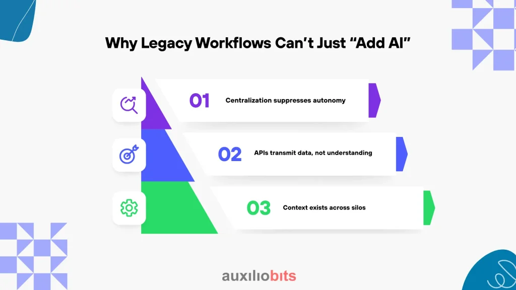 - Legacy workflows can’t simply bolt on AI; they require decentralized reasoning, semantic understanding, and cross-silo context to behave intelligently.