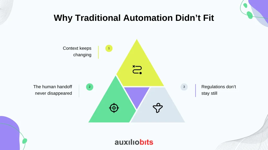 - The human handoff never disappeared: When something didn’t fit a rule, bots stopped and sent it to a human. That “human in the loop” turned into “human on every loop.”