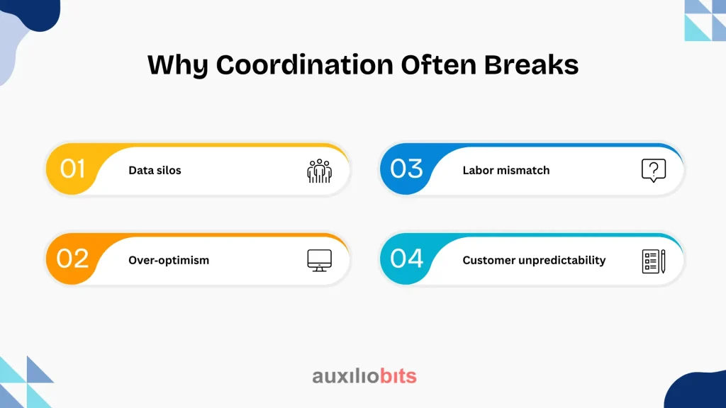 • Coordination often fails due to human and system misalignment, not lack of innovation. Data silos, mismatched staffing, unrealistic promises, and KPI conflicts break orchestration more than hardware limitations.