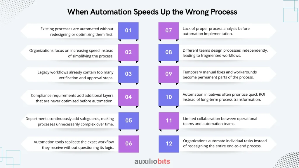 - Automating flawed processes only accelerates inefficiency. Without redesigning workflows, automation can speed up the movement of information while leaving operational bottlenecks untouched.